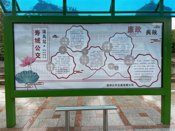 二是建設(shè)“壽城公交清風(fēng)站”。選取靈峰廣場、賀州市教育局公交站臺(tái),將廉政典故、家庭家教家風(fēng)建設(shè)、創(chuàng)建文明城市等內(nèi)容融入公交站臺(tái)宣傳版面,在潛移默化中使廉政文化在市民心中生根發(fā)芽,最大限度地發(fā)揮了文化潤廉的良好作用。
